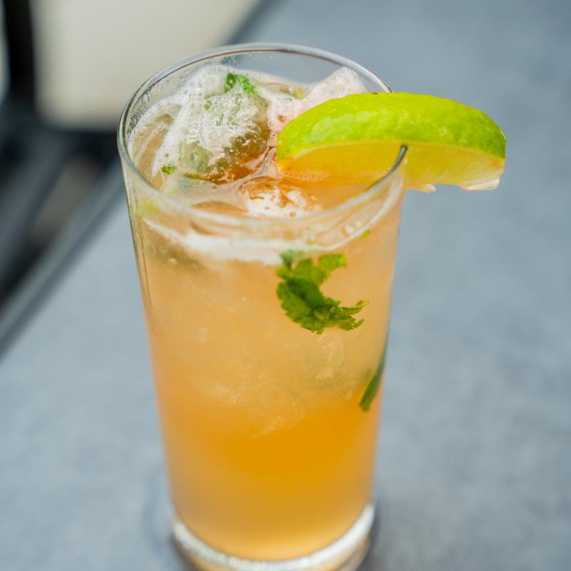 Bacardi Rum, peach purée, mint leaves, lime juice, simple syrup & club soda