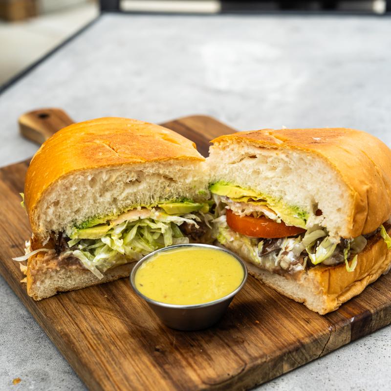 Torta bun filled with mayo, refried beans, Monterrey Jack cheese, sour cream, lettuce, tomatoes, sliced avocado with your choice of meat • Chicken $ 13.99| Mix $14.99| Beef $15.99| Al Pastor $15.99